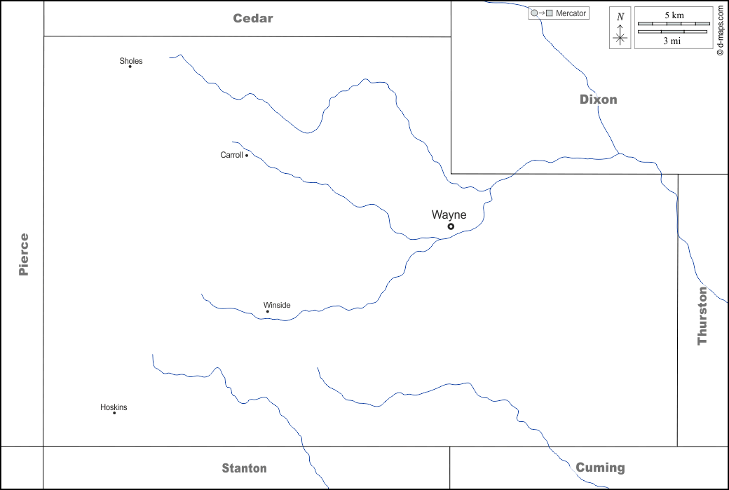 d-maps > United States of America (USA) > Nebraska > Wayne County > boundaries, hydrography, main cities, names, white