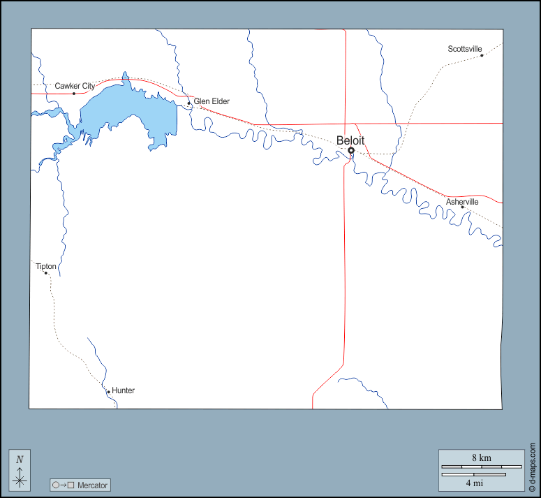d-maps > United States of America (USA) > Kansas > Mitchell County > outline, hydrography, main cities, roads, names