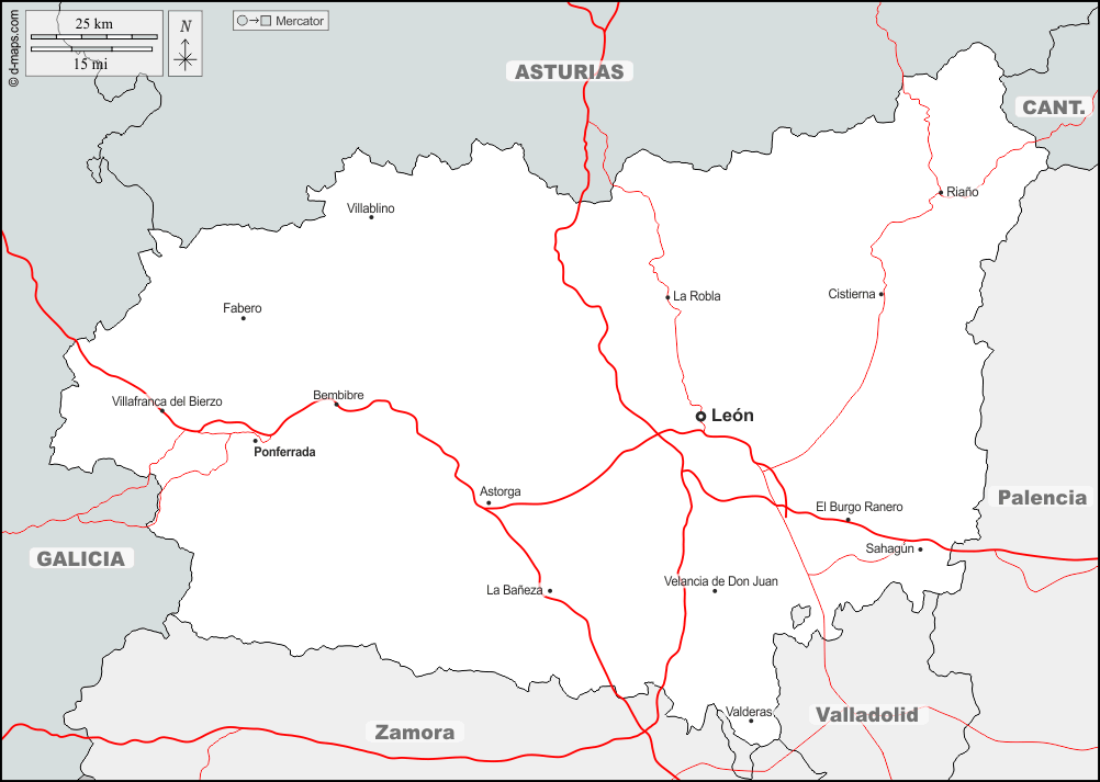 d-maps > Europe > Spain > León > boundaries, main cities, roads, names