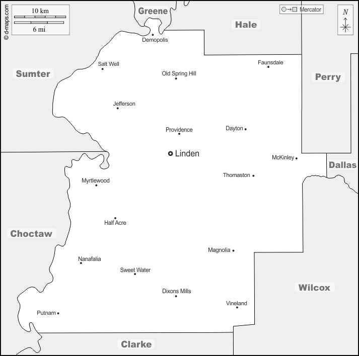 Dayton - Demopolis - Dixons Mills - Faunsdale - Half Acre - Jefferson - Linden - Magnolia - McKinley - Myrtlewood - Nanafalia - Old Spring Hill - Providence - Putnam - Salt Well - Sweet Water - Thomaston - Vineland