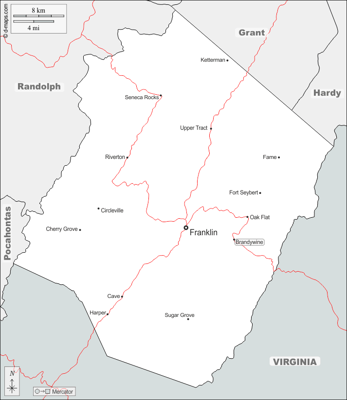 d-maps > United States of America (USA) > West Virginia > Pendleton County > boundaries, main cities, roads, names