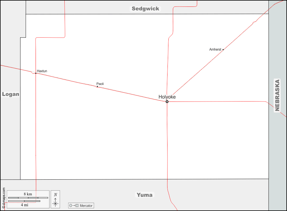 d-maps > United States of America (USA) > Colorado > Phillips County > boundaries, main cities, roads, names
