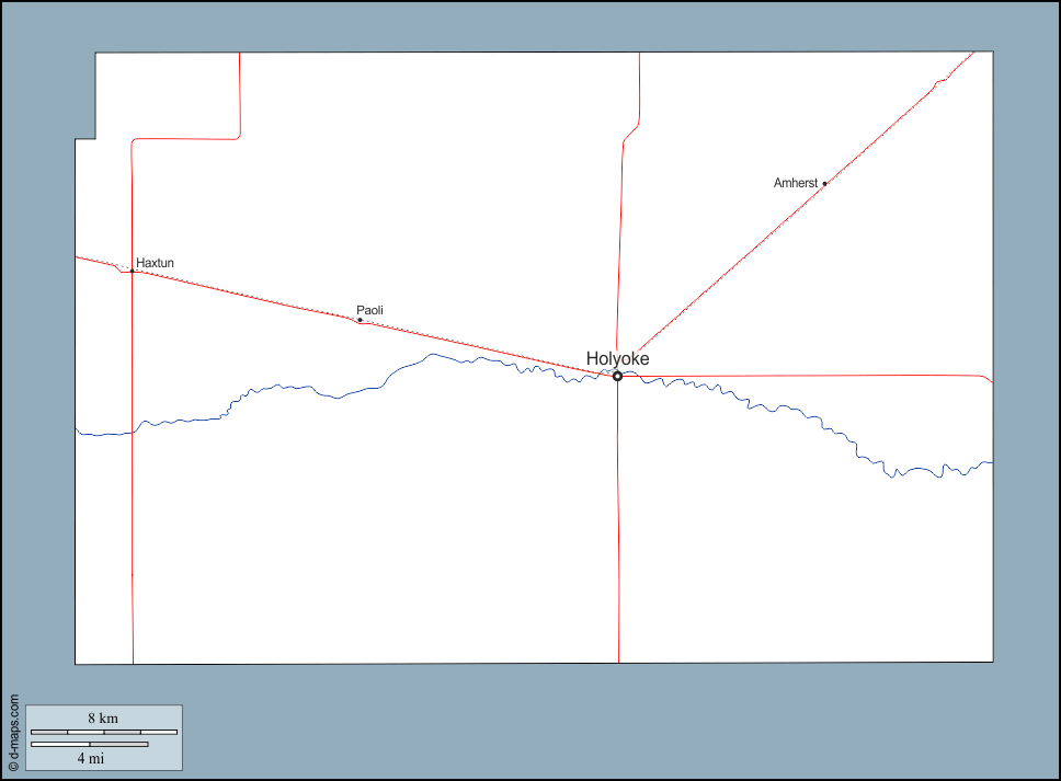 d-maps > United States of America (USA) > Colorado > Phillips County > outline, hydrography, main cities, roads, names