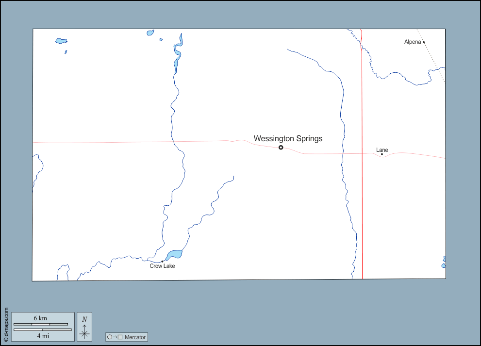 d-maps > United States of America (USA) > South Dakota > Jerauld County > outline, hydrography, main cities, roads, names