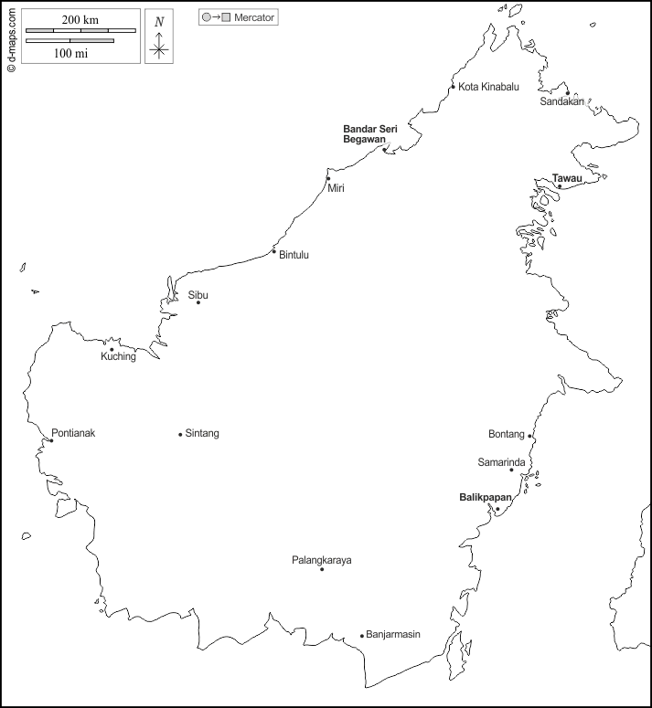 d-maps > Asia > Borneo > coasts, main cities, names, white
