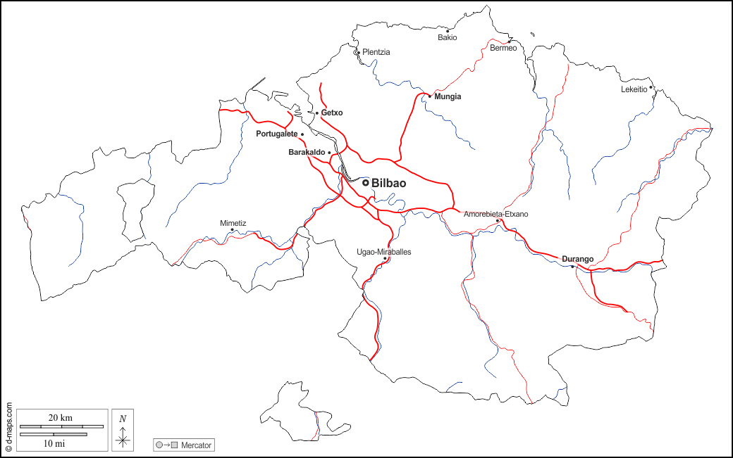 d-maps > Europe > Spain > Biscay > outline, hydrography, main cities, roads, names, white