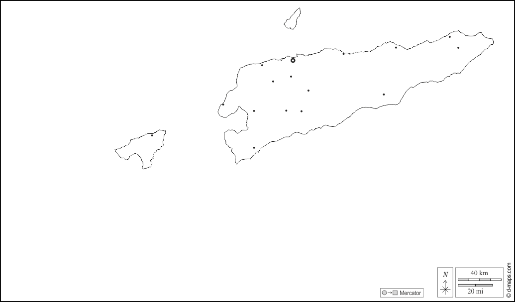 Aileu, Ainaro, Batugade, Baukau, Dili, Ermera, Lautem, Liquica, Los Palaus, Maliana, Manatuto, Maubisse, Pante Macassar, Same, Suai, Viqueque.
