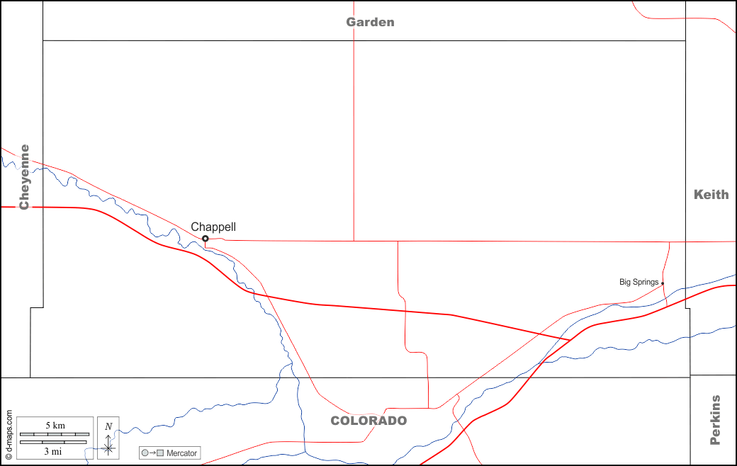 d-maps > United States of America (USA) > Nebraska > Deuel County > boundaries, hydrography, main cities, roads, names, white