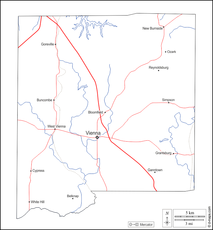 d-maps > United States of America (USA) > Illinois > Johnson County > outline, hydrography, main cities, roads, names, white
