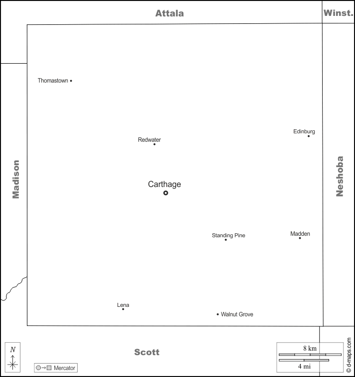 d-maps > United States of America (USA) > Mississippi > Leake County > boundaries, main cities, names, white