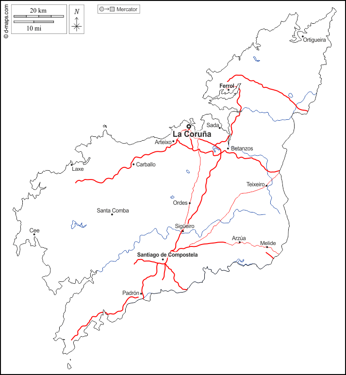 d-maps > Europe > Spain > A Coruña > outline, hydrography, main cities, roads, names, white