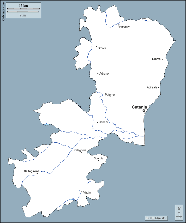 d-maps > Europe > Italy > Catania > outline, hydrography, main cities, names