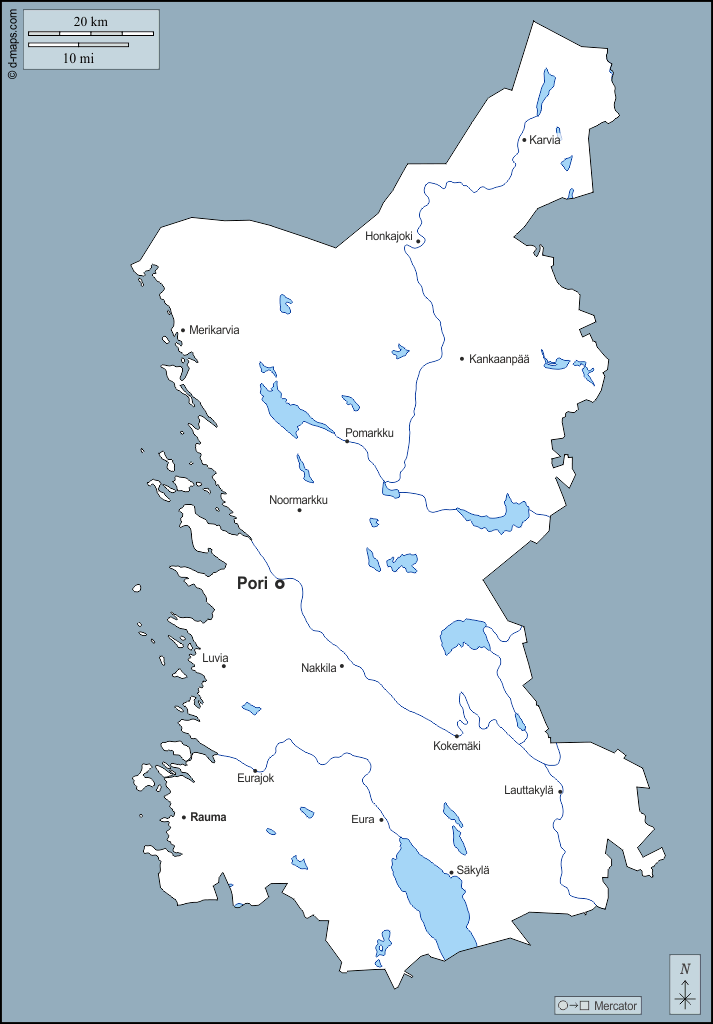 d-maps > Europe > Finland > Satakunta > outline, hydrography, main cities, names