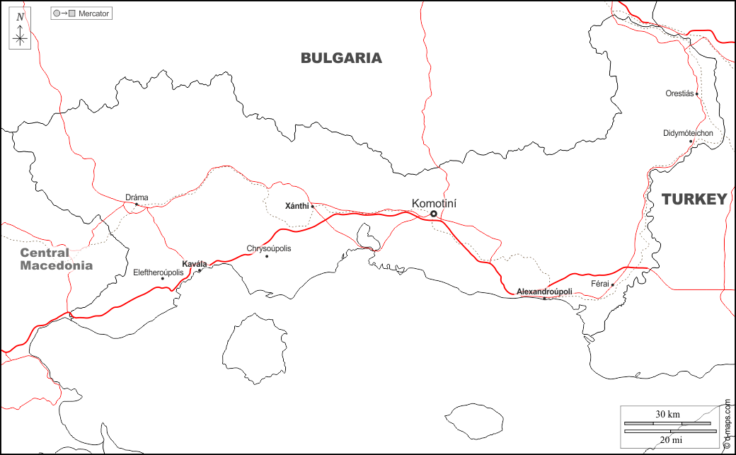 d-maps > Europe > Greece > East Macedonia and Thrace > boundaries, main cities, roads, names, white