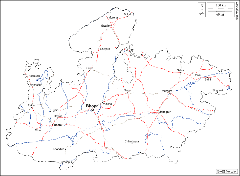 d-maps > Asia > India > Madhya Pradesh > outline, hydrography, main cities, roads, names, white