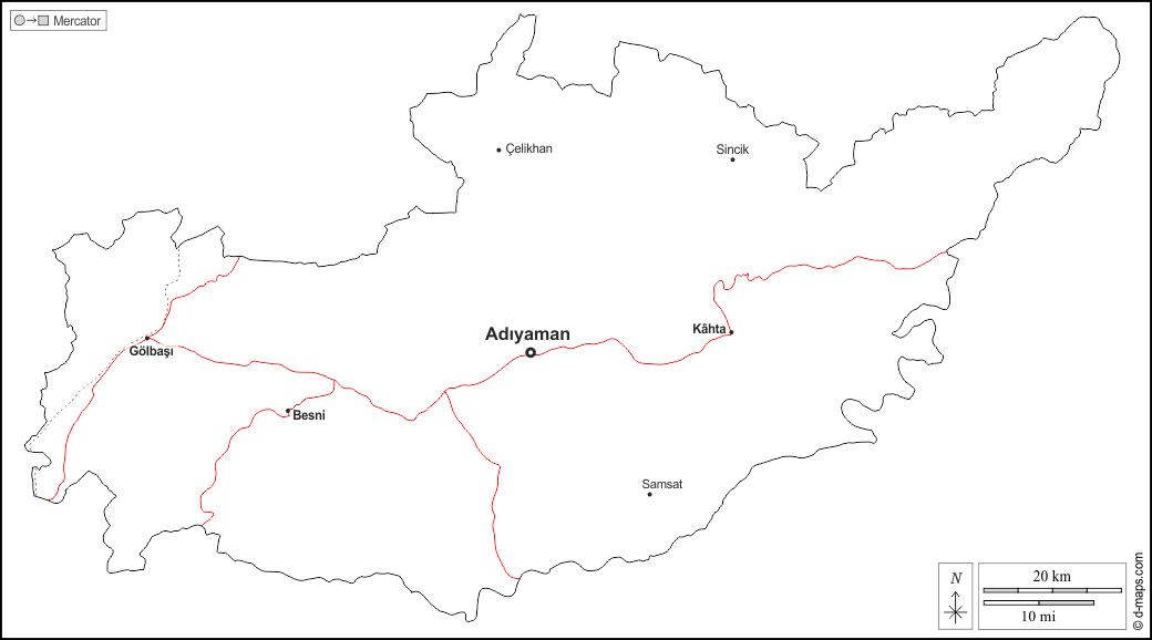 d-maps > Asia > Turkey > Adıyaman > outline, main cities, roads, names, white