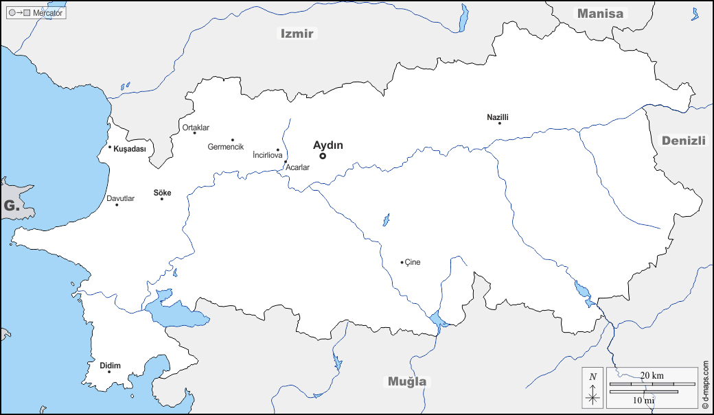 d-maps > Asia > Turkey > Aydın > boundaries, hydrography, main cities, names