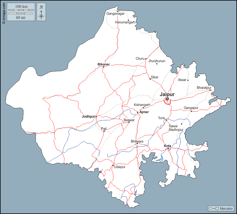 d-maps > Asia > India > Rajasthan > outline, hydrography, main cities, roads, names