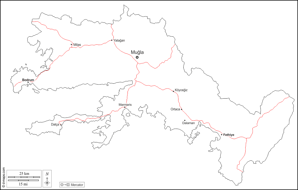 d-maps > Asia > Turkey > Muğla > outline, main cities, roads, names, white