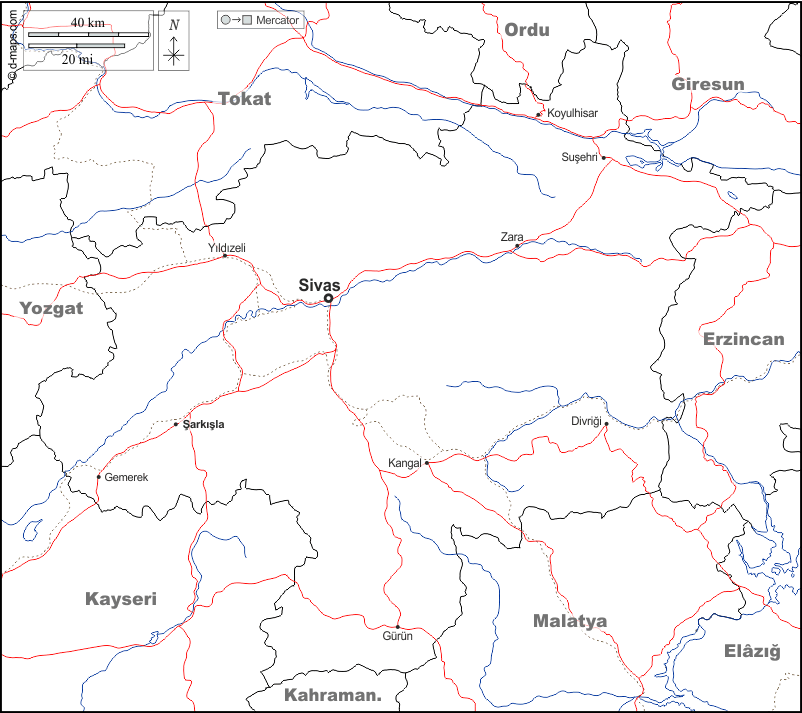 d-maps > Asia > Turkey > Sivas > boundaries, hydrography, main cities, roads, names, white