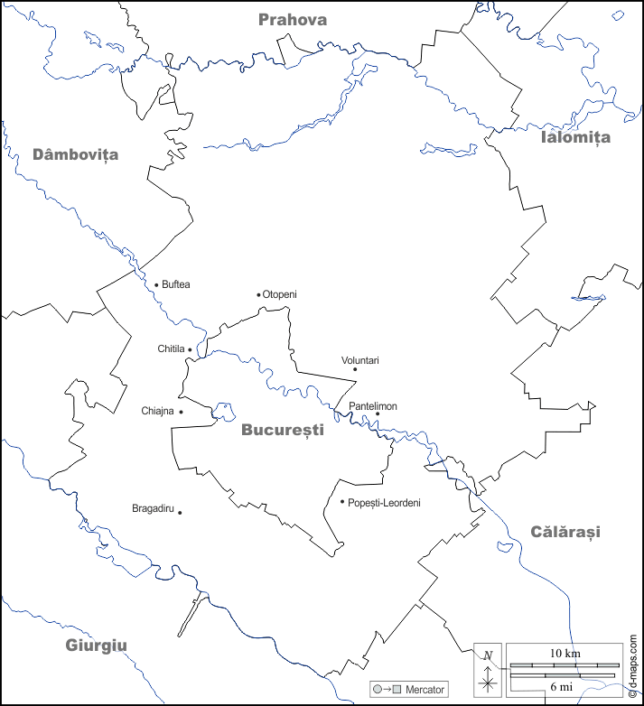 d-maps > Europe > Romania > Ilfov > boundaries, hydrography, main cities, names, white