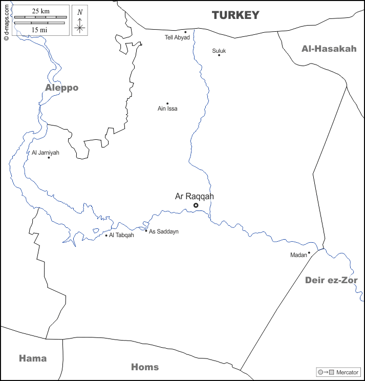 Asia > Syria > Raqqa > boundaries, hydrography, main cities, names, white