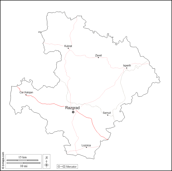 d-maps > Europe > Bulgaria > Razgrad Province > outline, main cities, roads, names, white