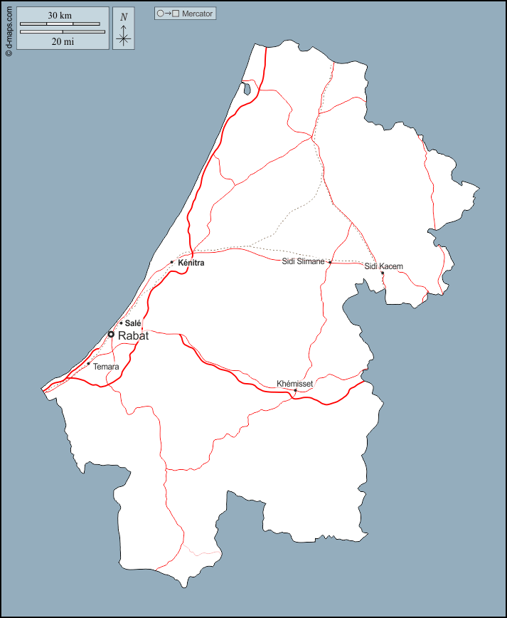 d-maps > Africa > Morocco > Rabat-Salé-Kénitra > outline, main cities, roads, names
