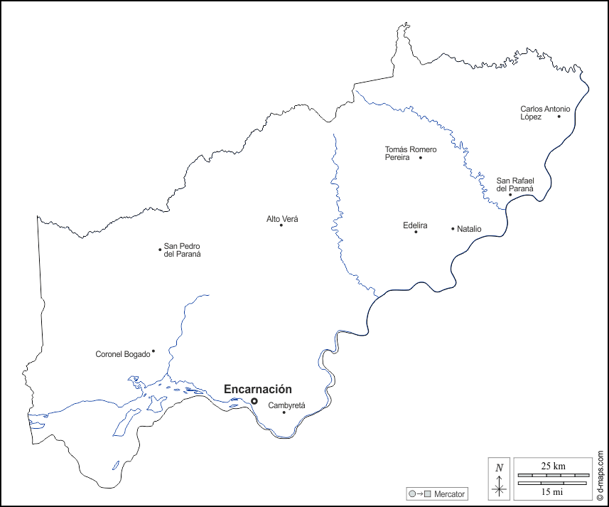 d-maps > Americas > Paraguay > Itapúa > outline, hydrography, main cities, names, white