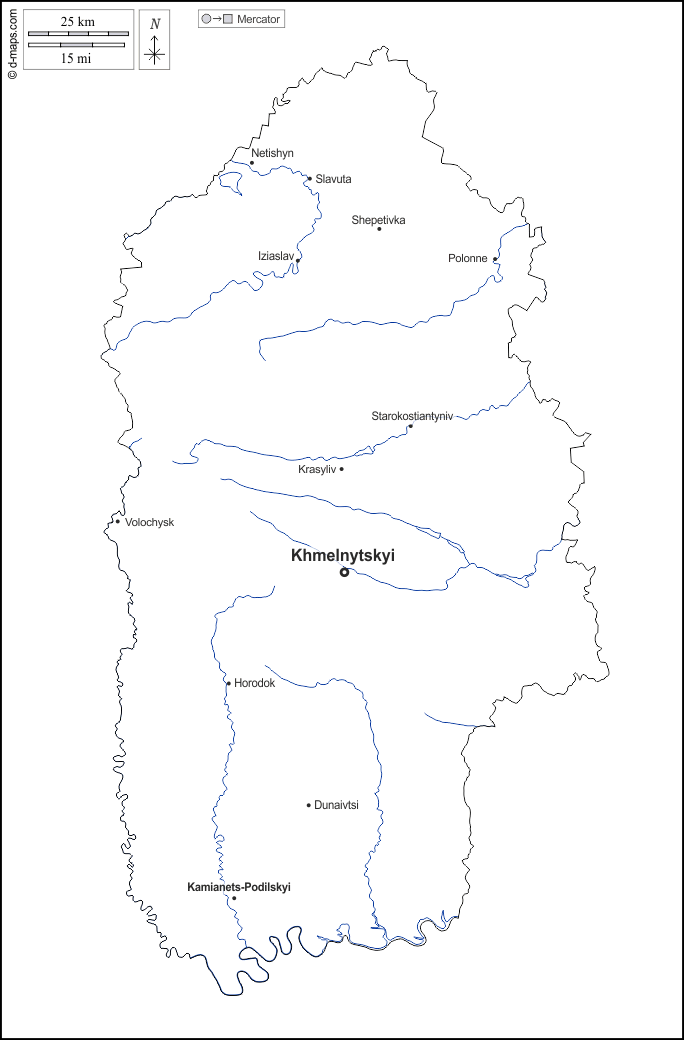 Europe > Ukraine > Khmelnytskyi > outline, hydrography, main cities, names, white