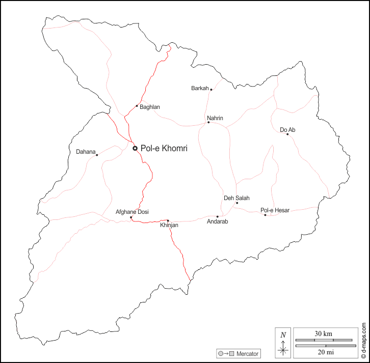 d-maps > Asia > Afghanistan > Baghlan Province > outline, main cities, roads, names, white