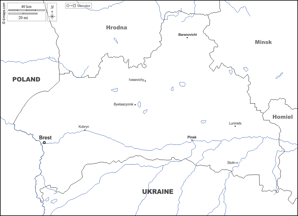 d-maps > Europe > Belarus > Brest Region > boundaries, hydrography, main cities, names, white