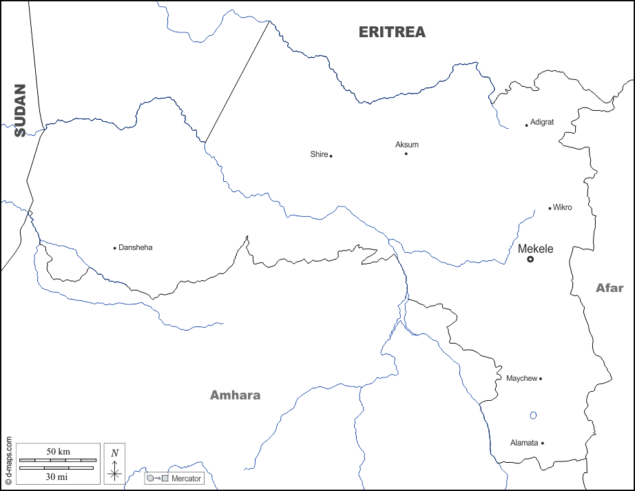 d-maps > Africa > Ethiopia > Tigray > boundaries, hydrography, main cities, names, white