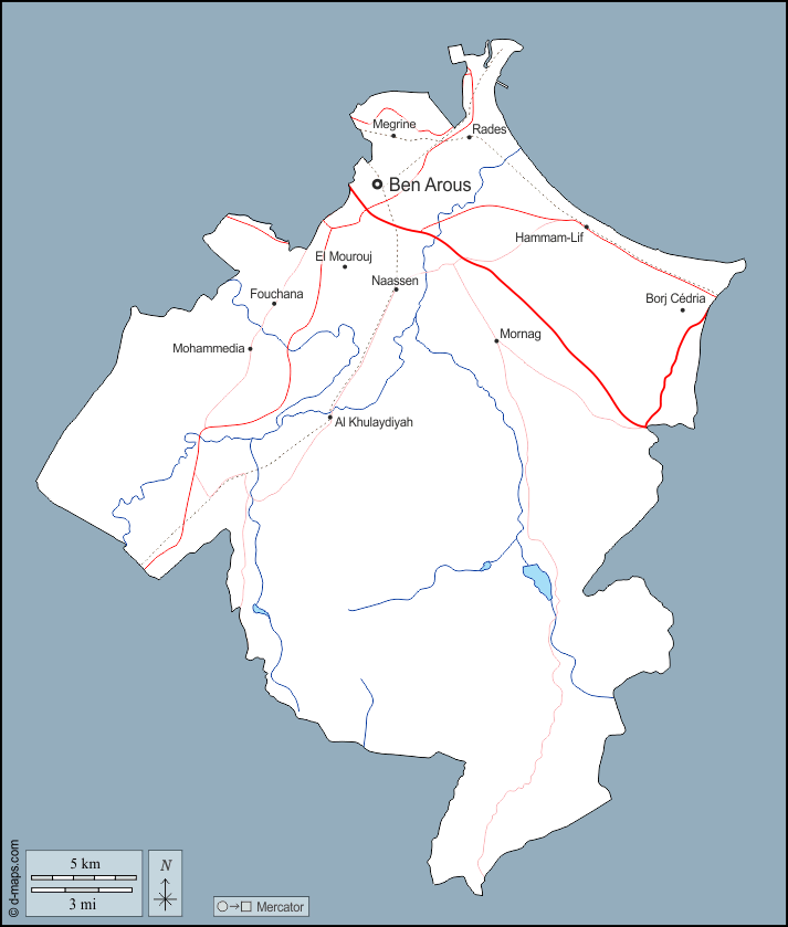 d-maps > Africa > Tunisia > Ben Arous > outline, hydrography, main cities, roads, names