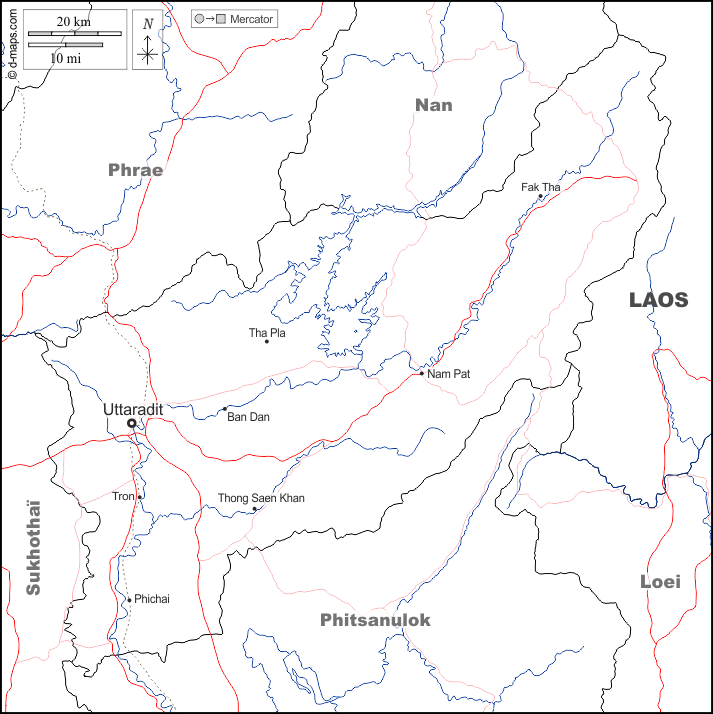 d-maps > Asia > Thaïlande > Uttaradit > boundaries, hydrography, main cities, roads, names, white