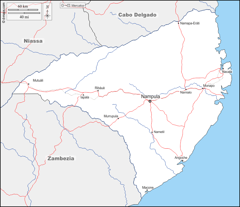 d-maps > Africa > Mozambique > Nampula > boundaries, hydrography, main cities, roads, names