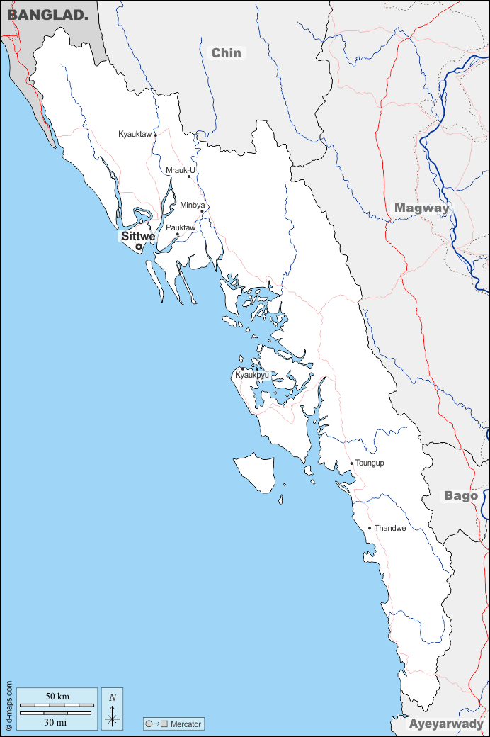 d-maps > Asia > Burma Myanmar > Rakhine State > boundaries, hydrography, main cities, roads, names
