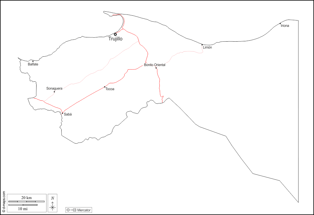 d-maps > Americas > Honduras > Colón > outline, main cities, roads, names, white