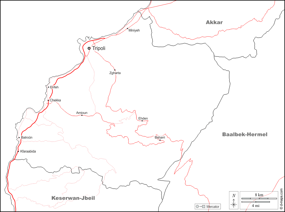 d-maps > Asia > Lebanon > North > boundaries, main cities, roads, names, white