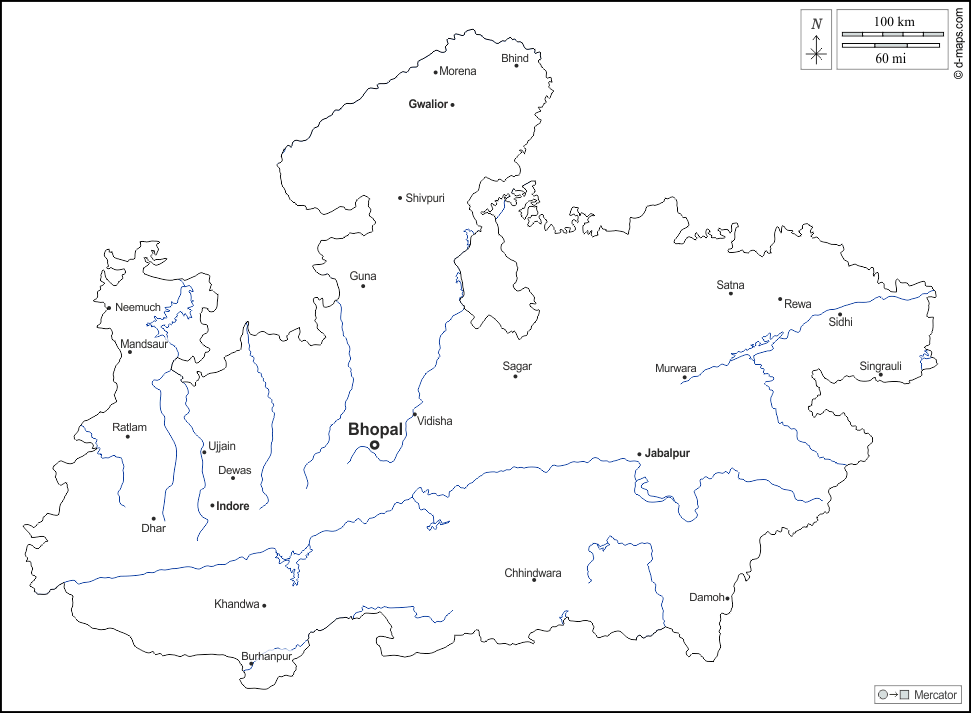 d-maps > Asia > India > Madhya Pradesh > outline, hydrography, main cities, names, white