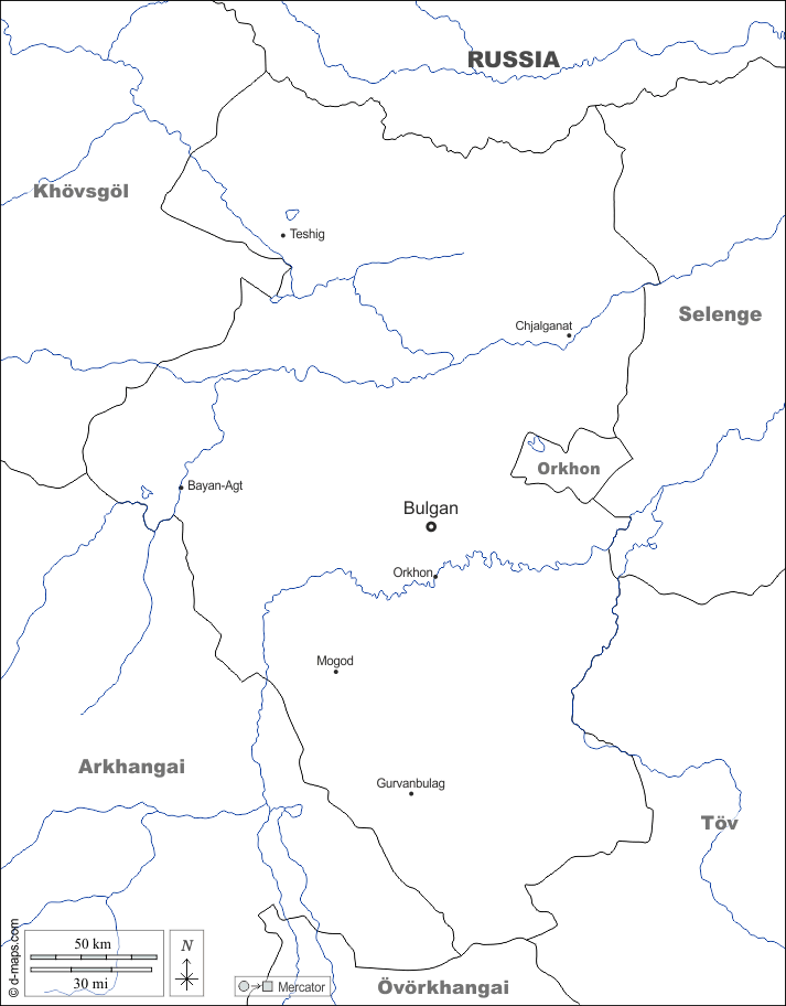 d-maps > Asia > Mongolia > Bulgan > boundaries, hydrography, main cities, names, white