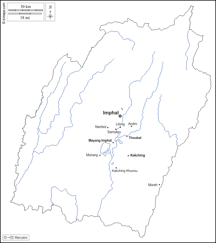 d-maps > Asia > India > Manipur > outline, hydrography, main cities, names, white