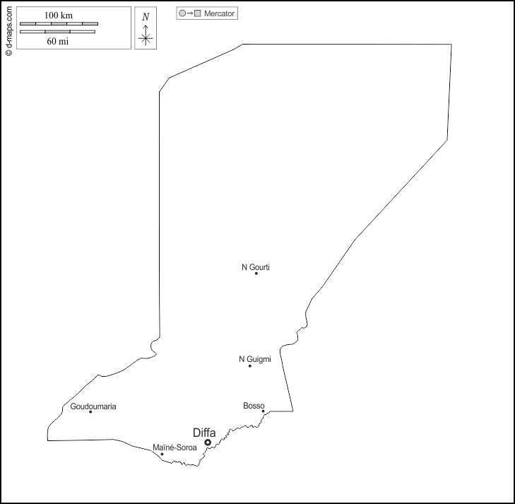 Africa > Niger > Diffa > outline, main cities, names, white