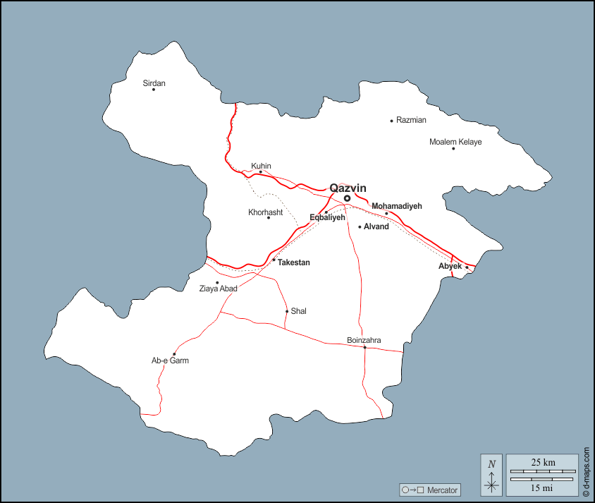 d-maps > Asia > Iran > Qazvin > outline, main cities, roads, names