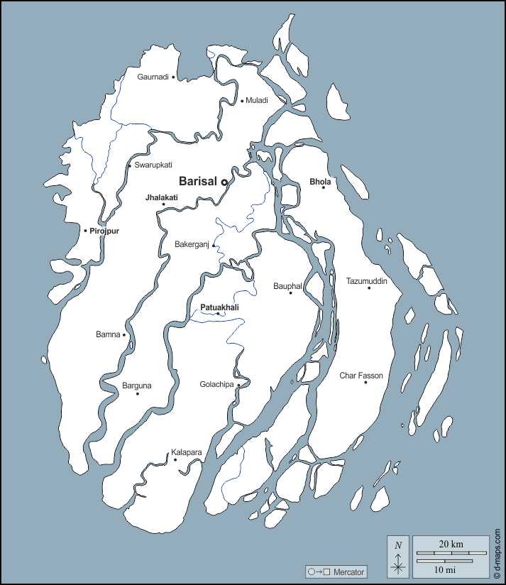 d-maps > Asia > Bangladesh > Barisal Division > outline, hydrography, main cities, names