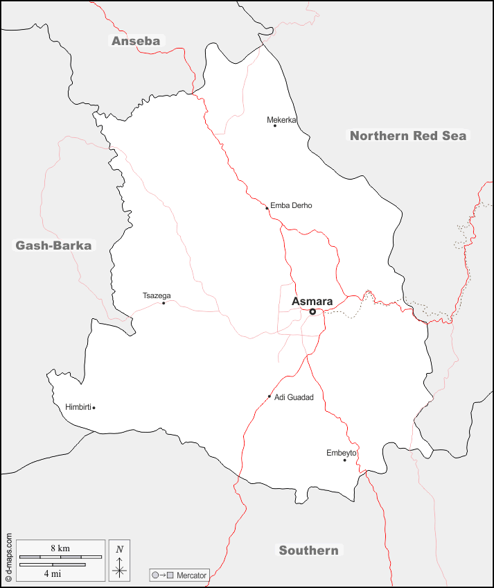 d-maps > Africa > Eritrea > Central > boundaries, main cities, roads, names