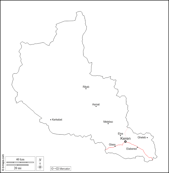 d-maps > Africa > Eritrea > Anseba > outline, main cities, roads, names, white