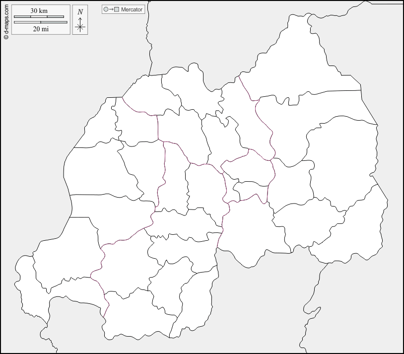 Bugesera, Burera, Gakenke, Gasabo, Gatsibo, Gicumbi, Gisagara, Huye, Kamonyi, Karongi, Kayonza, Kicukiro, Kirehe, Muhanga, Musanze, Ngoma, Ngororero, Nyabihu, Nyagatare, Nyamagabe, Nyamasheke, Nyanza, Nyarugenge, Nyaruguru, Rubavu, Ruhango, Rulindo, Rusizi, Rutsiro, Rwamagana.