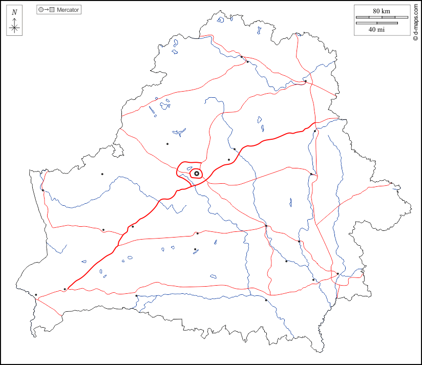 d-maps > Europe > Belarus > Belarus > outline, hydrography, main cities, roads, white