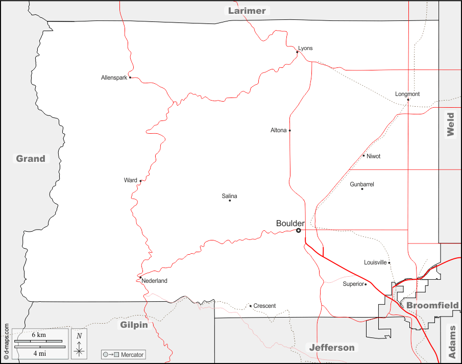 d-maps > United States of America (USA) > Colorado > Boulder County > boundaries, main cities, roads, names